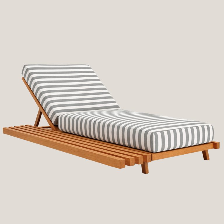 The Awan chaise lounge is a refined outdoor statement piece, crafted from premium teak wood with a warm, natural tone that highlights its clean architectural lines and precision joinery. The elongated slatted base creates a sense of lightness and rhythm, while the adjustable backrest introduces both functionality and a sculptural profile. Upholstered in high-quality outdoor fabric, the cushion features a soft striped pattern that adds visual depth and a relaxed coastal character, balancing structure with comfort. The overall aesthetic is calm and contemporary, defined by understated elegance, tactile materials, and a harmonious blend of geometry and softness—designed to elevate outdoor living with both visual clarity and lasting durability.